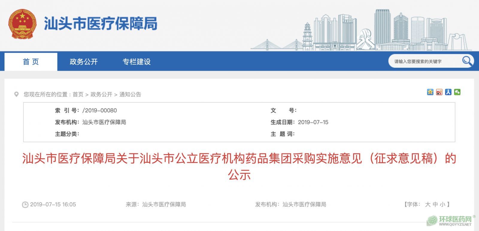 7月15日,汕頭市醫(yī)保局發(fā)布文件《關(guān)于汕頭市公立醫(yī)療機構(gòu)藥品集團采購實施意見(征求意見稿)的公示》(以下簡稱《意見》)。