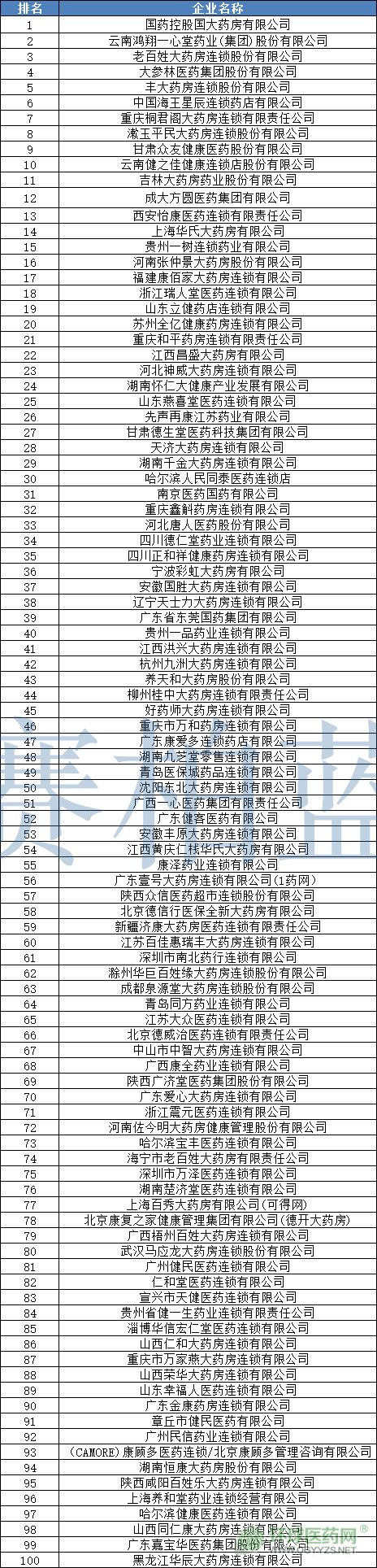 “2018-2019年度中國連鎖藥店綜合實力百強企業(yè)”排名前十的藥店有: