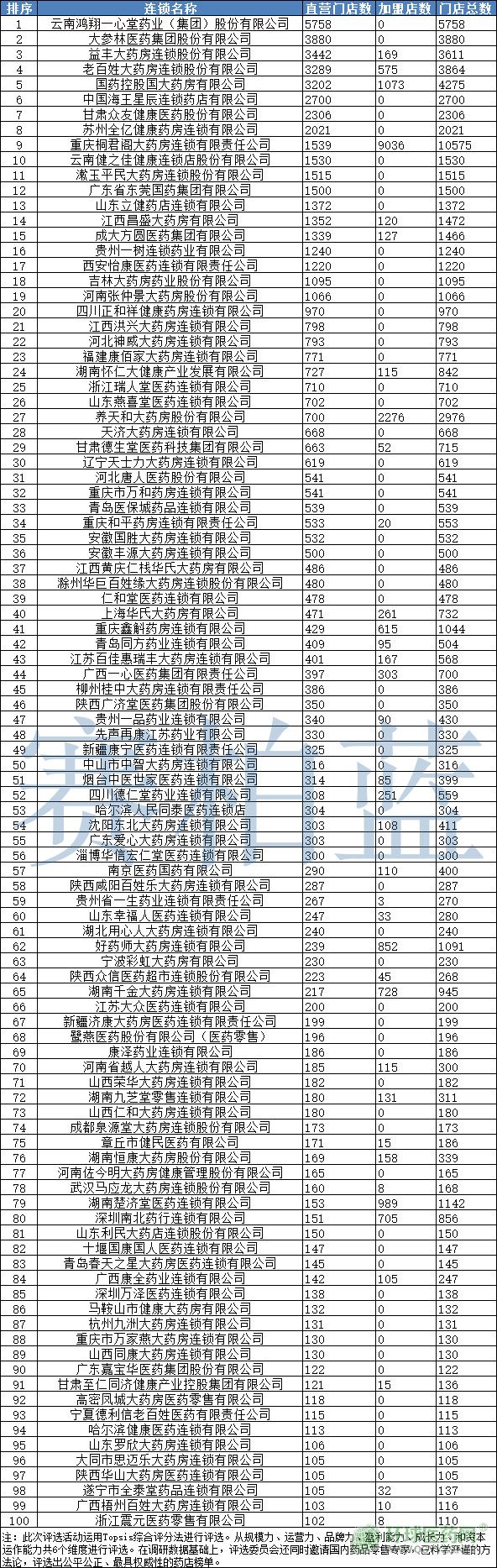 老百姓大藥房連鎖股份有限公司以3289家直營門店的數(shù)量排名第四;