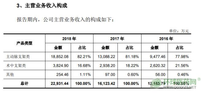 據(jù)其公司公告顯示,2016年至2018年,公司營收分別為1.25億元、1.65億元及2.31億元。其主動脈支架類銷售收入占總營收的比例一直在80%左右。據(jù)其招股書顯示,其產(chǎn)品已銷售至國內(nèi)30個省、自治區(qū)和直轄市的700多家醫(yī)院。