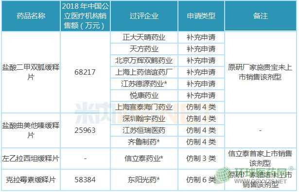 從新注冊(cè)分類申報(bào)情況看,鹽酸普拉克索緩釋片申報(bào)最為激烈,共10家藥企以仿制藥4類/進(jìn)口5.2類申報(bào)上市,2018年中國(guó)公立醫(yī)療機(jī)構(gòu)終端普拉克索的銷(xiāo)售額為6.88億元,其中緩釋片僅占2.76%的市場(chǎng)份額,目前國(guó)內(nèi)市場(chǎng)僅原研廠家勃林格殷格翰上市銷(xiāo)售鹽酸普拉克索片及鹽酸普拉克索緩釋片;鹽酸二甲雙胍緩釋片有6家藥企按仿制藥3類或4類申報(bào)上市,該產(chǎn)品已有7家藥企過(guò)評(píng),6家藥企提交一致性評(píng)價(jià)補(bǔ)充申請(qǐng),為緩控釋片一致性評(píng)價(jià)申報(bào)中最熱門(mén)的產(chǎn)品。