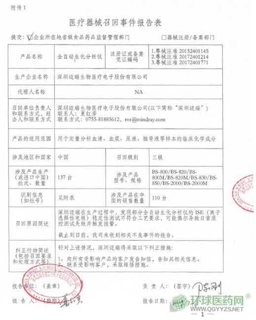 召回的原因是:深圳邁瑞在生產(chǎn)過(guò)程中,發(fā)現(xiàn)部分全自動(dòng)生化分析儀的ISE模塊,其該批次部件存在瑕疵。截至目前,邁瑞暫未收到不良事件的報(bào)告。召回級(jí)別為三級(jí)。