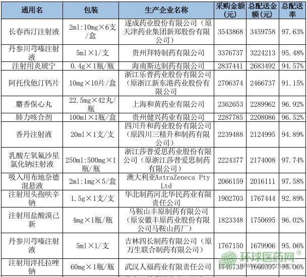 其中,采購金額排名前100的藥品,采購總額為1.06億元,配送金額為1億元。