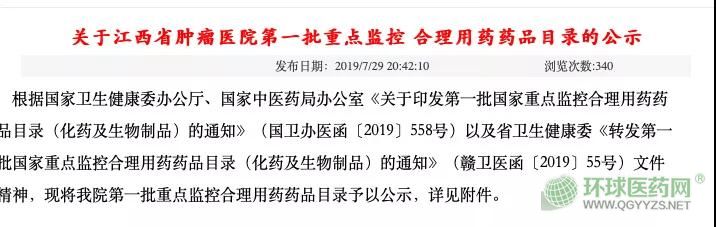 據(jù)賽柏藍(lán)查詢(xún),在江西省腫瘤醫(yī)院之前,7月15日,江西省衛(wèi)健委發(fā)布了《轉(zhuǎn)發(fā)第一批國(guó)家重點(diǎn)監(jiān)控合理用藥藥品目錄(化藥及生物制品)的通知》贛衛(wèi)醫(yī)函〔2019〕55號(hào)。