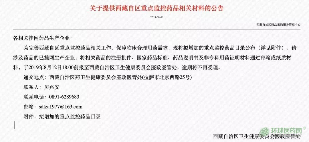 公告顯示,為完善西藏自區(qū)重點(diǎn)監(jiān)控藥品相關(guān)工作,保障臨床合理用藥需求,現(xiàn)將擬增加的重點(diǎn)監(jiān)控藥品目錄公布,請(qǐng)涉及藥品的已掛網(wǎng)生產(chǎn)企業(yè),將相關(guān)藥品的注冊(cè)批件、國(guó)家藥品標(biāo)準(zhǔn)、藥品說(shuō)明書及非?朴盟幾C明材料通過(guò)郵箱或紙質(zhì)材料,于2019年8月12日18:00前報(bào)至西藏自治區(qū)衛(wèi)生健康委員會(huì)醫(yī)政醫(yī)管處,逾期將不再受理。