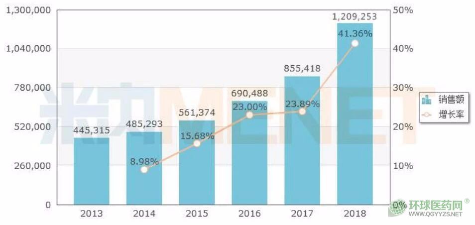 2018年在中國城市公立醫(yī)院、縣級(jí)公立醫(yī)院、城市社區(qū)中心及鄉(xiāng)鎮(zhèn)衛(wèi)生院(簡稱中國公立醫(yī)療機(jī)構(gòu))終端化學(xué)藥抗腫瘤藥的市場規(guī)模接近800億元,9個(gè)小類中超過百億規(guī)模的有抗代謝藥、蛋白激酶抑制劑、植物生物堿和其他天然藥、單克隆抗體,其中單克隆抗體的銷售額從2013年44.5億元飆漲至2018年的120.9億元,增速相當(dāng)驚人。