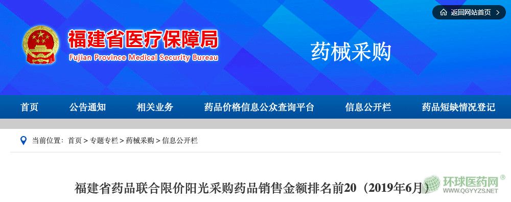 8月6日,福建省醫(yī)保局發(fā)布“福建省藥品聯(lián)合限價(jià)陽(yáng)光采購(gòu)藥品銷售排名前20(2019年6月)名單”。