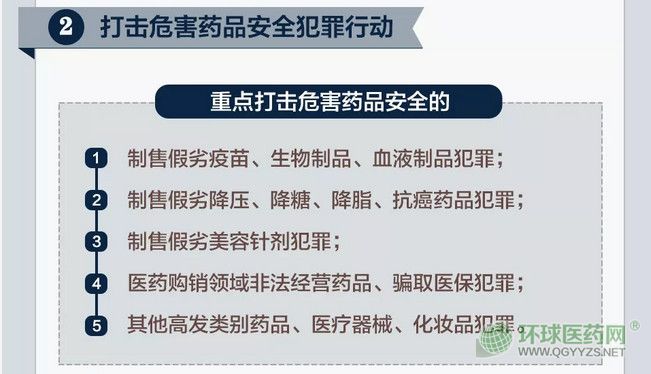 其中,對于藥品安全,重點打擊這五點:制售假劣疫苗、生物制品、血液制品犯罪;制售假劣降壓藥、降糖、降脂、抗癌藥品犯罪;制售假劣美容針劑犯罪;醫(yī)藥購銷領(lǐng)域非法經(jīng)營藥品、騙取醫(yī)保犯罪以及其他;其他高發(fā)類別藥品、醫(yī)療器械、化妝品犯罪。
