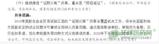 具體措施包括,2019年底前在自由貿(mào)易試驗(yàn)區(qū)啟動(dòng)“證照分離”改革全覆蓋試點(diǎn)工作,將中央層面和地方層面設(shè)定的涉企經(jīng)營(yíng)許可事項(xiàng)全部納入改革范圍,通過(guò)直接取消審批、審批改為備案、實(shí)行告知承諾、優(yōu)化審批服務(wù)等四種方式分類(lèi)推進(jìn)改革,2020年下半年在全國(guó)推開(kāi)。
