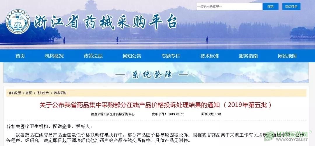 8月15日,浙江省藥械采購中心發(fā)布《關(guān)于公布我省藥品集中采購部分在線產(chǎn)品價格投訴處理結(jié)果的通知(2019年第五批)》(以下簡稱《通知》)。 《通知》顯示,浙江省藥品在線交易產(chǎn)品全國最低價格聯(lián)動結(jié)果執(zhí)行中,部分產(chǎn)品因價格等原因被投訴。根據(jù)浙江省藥品集中采購工作有關(guān)規(guī)定,通過核查、公示等程序,經(jīng)研究,決定即日起下調(diào)瑞舒伐他汀鈣片等產(chǎn)品在線交易價格。