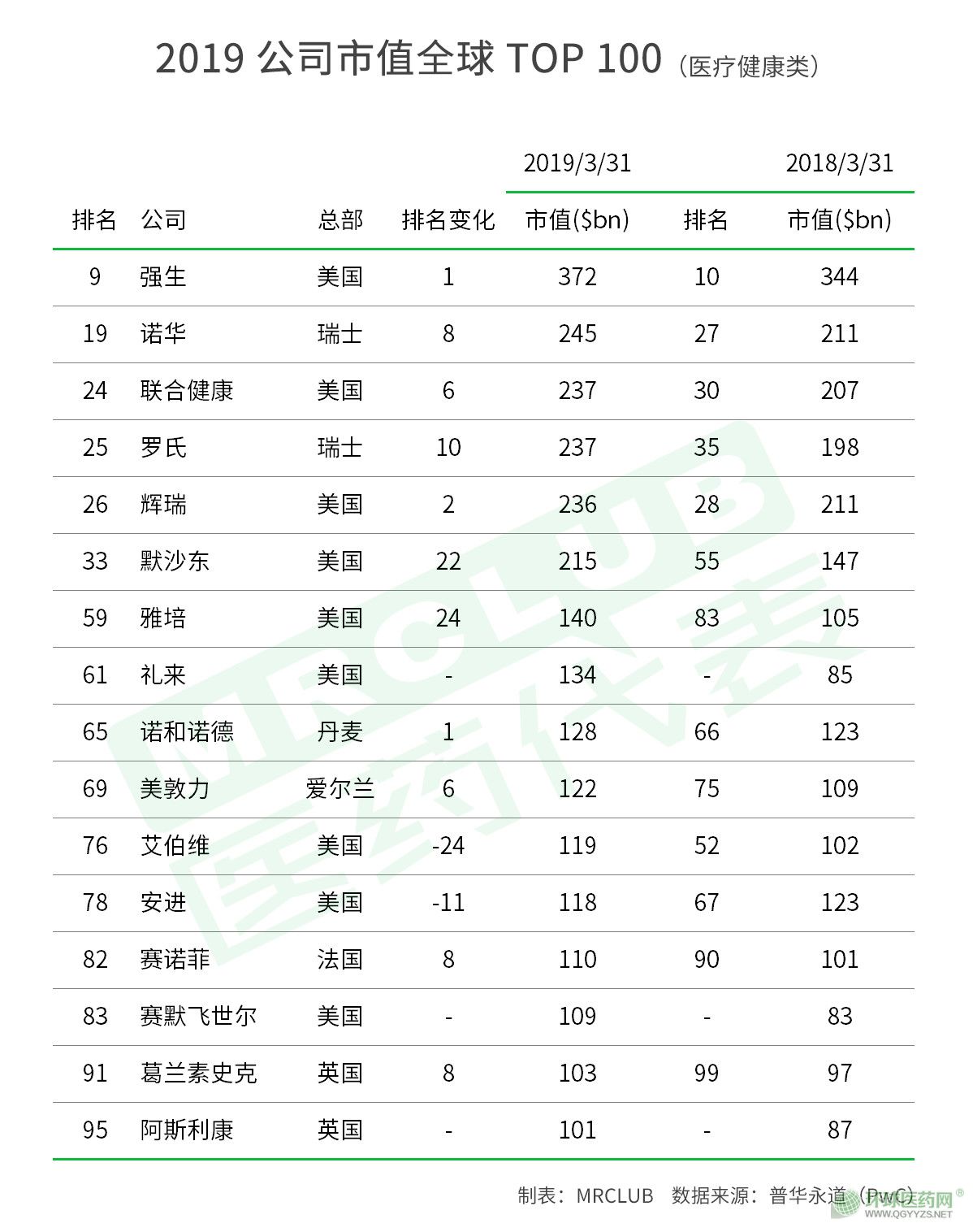 而市值最高的醫(yī)藥企業(yè)強(qiáng)生是 3720 億美元,位居百?gòu)?qiáng)企業(yè)第 9 位。