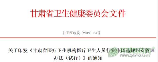 8月16日,甘肅省衛(wèi)健委發(fā)布《甘肅省醫(yī)療衛(wèi)生機(jī)構(gòu)醫(yī)療衛(wèi)生人員行業(yè)作風(fēng)違規(guī)問責(zé)管理辦法(試行)》(以下簡(jiǎn)稱《試行辦法》)。《試行辦法》自發(fā)布之日起施行,有效期2年。