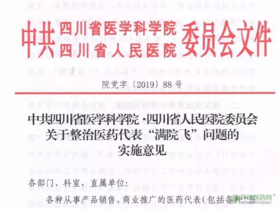 8月16日,大三甲四川省醫(yī)院科學(xué)院·四川省人民醫(yī)院發(fā)布文件,整治醫(yī)藥代表“滿院飛”問(wèn)題,臨床醫(yī)技科室接待藥械企業(yè)僅限于醫(yī)藥學(xué)術(shù)代表;禁止醫(yī)藥銷售代表進(jìn)入醫(yī)療服務(wù)區(qū)域從事商業(yè)推廣活動(dòng)。