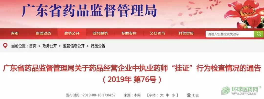 8月16日,廣東省藥監(jiān)局發(fā)布《關(guān)于藥品經(jīng)營企業(yè)中執(zhí)業(yè)藥師“掛證”行為檢查情況的通告(2019年 第76號)》。