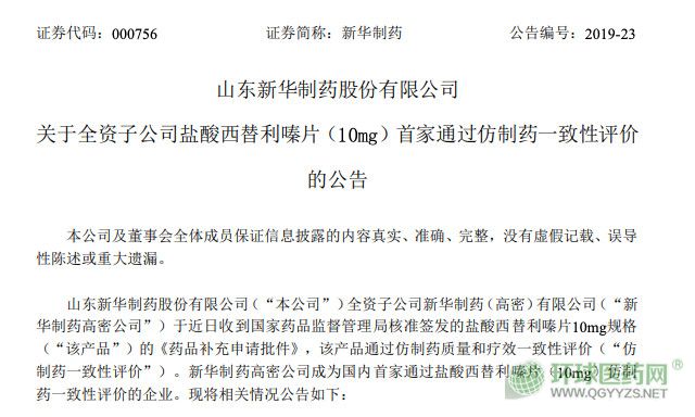 8月19日,新華制藥發(fā)布《關(guān)于全資子公司鹽酸西替利嗪片(10mg)首家通過仿制藥一致性評價的公告》。