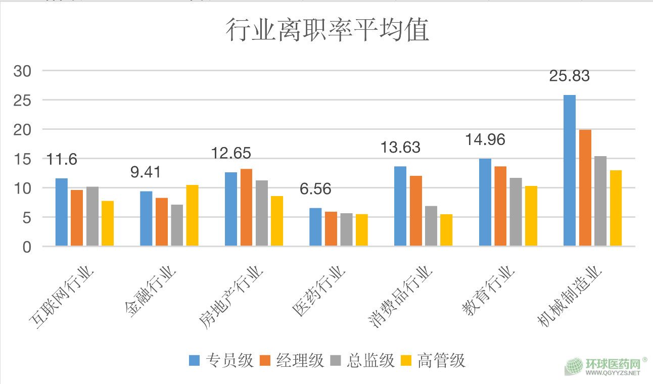 從總體平均離職率來(lái)看,醫(yī)藥行業(yè)的離職率仍然最低(5.91%),其次為金融行業(yè)(8.82%)、消費(fèi)品行業(yè)(9.50%)。