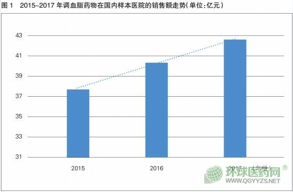 2017年,調(diào)血脂藥物在國內(nèi)樣本醫(yī)院的銷售額在心血管用藥各亞類中位居第一,約達(dá)到43億元(見圖1)。2015~2017年,調(diào)血脂藥物在心血管用藥中的市場(chǎng)份額處在前列,復(fù)合年均增長率(CAGR)為4.3%,增長幅度在心血管用藥各亞類中處在中游位置。