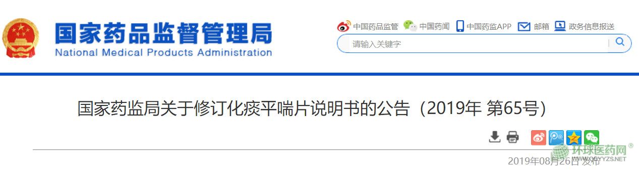 8月26日,國家藥監(jiān)局發(fā)布《關于修訂化痰平喘片說明書的公告(2019年 第65號)》,決定對化痰平喘片藥品說明書【不良反應】、【禁忌】和【注意事項】等項進行修訂。