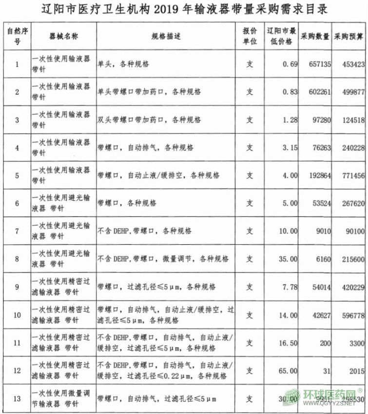 如“單頭,各種規(guī)格”的一次性使用帶針輸液器,采購數量657135支,采購預算453423元,遼陽市最低價格0.69元。