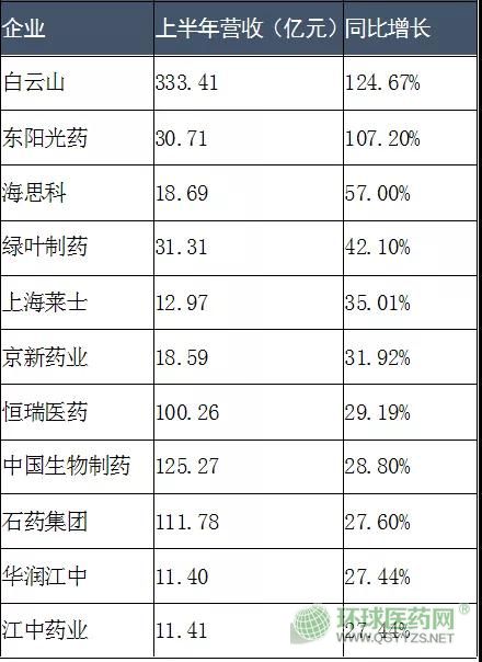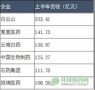 在統(tǒng)計(jì)范圍內(nèi),有6家企業(yè)半年?duì)I收過百億元人民幣。其中,白云山以333.41億元的銷售額居首位;復(fù)星醫(yī)藥(141.73億)和云南白藥(138.97億)分列二、三位。中國(guó)生物制藥、石藥集團(tuán)和恒瑞醫(yī)藥的半年?duì)I收均突破百億元。