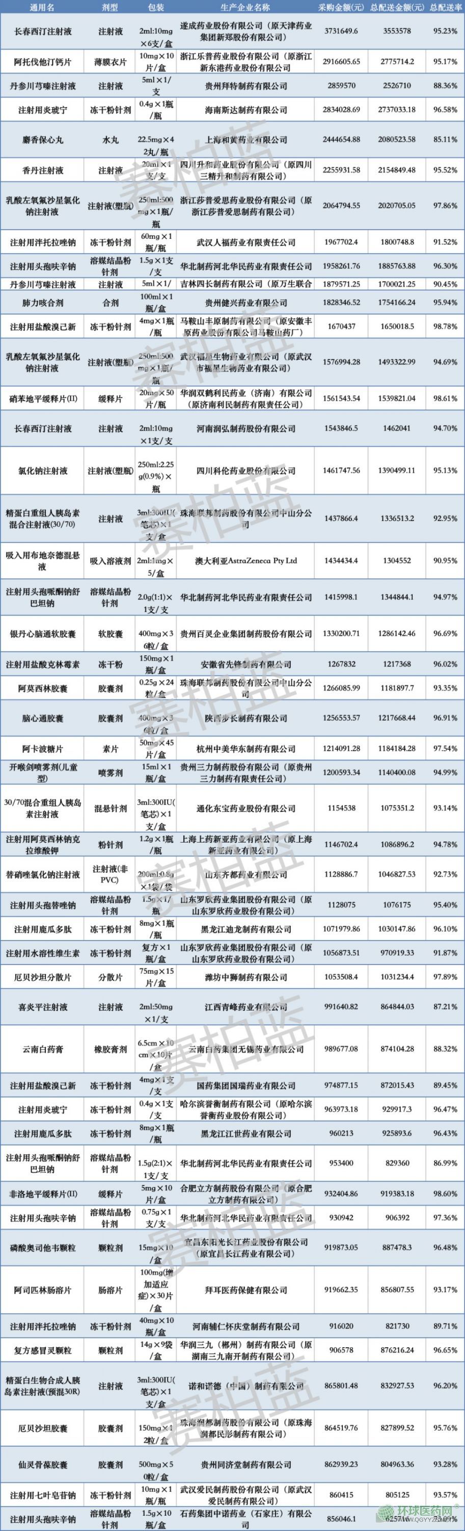 賽柏藍(lán)統(tǒng)計(jì)后發(fā)現(xiàn),采購金額排名前100的藥品,采購總額為1.05億,配送總金額9840萬。其中,遂成藥業(yè)的長春西汀注射液(373萬元)、浙江樂普藥業(yè)的阿托伐他汀鈣片(292萬)、貴州拜特制藥的丹參川穹嗪注射液(285萬元)排名前三名,海南斯達(dá)制藥的注射用炎琥寧和上海和黃藥業(yè)的麝香保心丸位居第四和第五名(完整排名附文章結(jié)尾)。