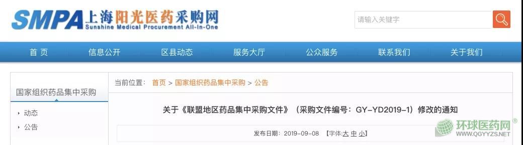 9月8日,上海陽光醫(yī)藥采購網(wǎng)發(fā)布了《關(guān)于《聯(lián)盟地區(qū)藥品集中采購文件》(采購文件編號:GY-YD2019-1)修改的通知》,在周末緊急宣布兩個品種采購量下調(diào)。