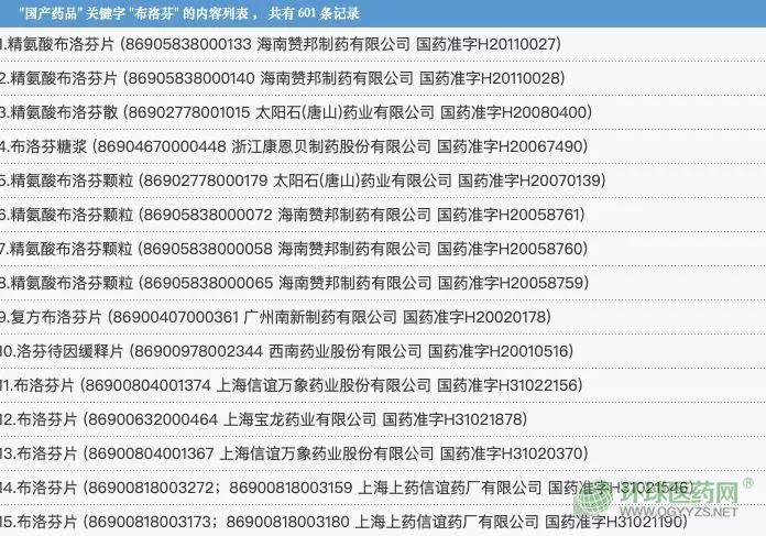 據(jù)賽柏藍(lán)查詢,布洛芬共有601條國產(chǎn)批文,無進(jìn)口批文,浙江康恩貝制藥、上海上藥信誼藥廠、葵花藥業(yè)、深圳信立泰、北京萬輝雙鶴制藥、哈藥集團(tuán)制藥總廠、華潤雙鶴藥業(yè)、北京四環(huán)制藥等知名藥企均持有該批文,可見該品種競爭的激烈程度。