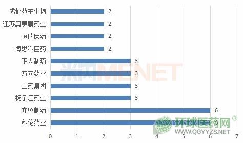 從企業(yè)申報情況看,26個品種涉及28家企業(yè)(以集團計),申報品種數(shù)超過3個(含3個)的有科倫藥業(yè)、齊魯制藥、揚子江藥業(yè)、上藥集團、方向藥業(yè)、正大制藥,其中科倫藥業(yè)、齊魯制藥以6個品種領(lǐng)跑。