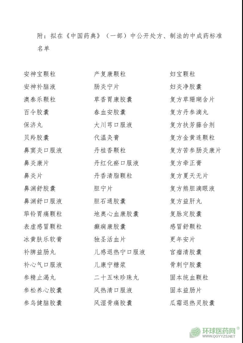 附:擬在《中國藥典》(一部)中公開處方、制法的中成藥標準名單