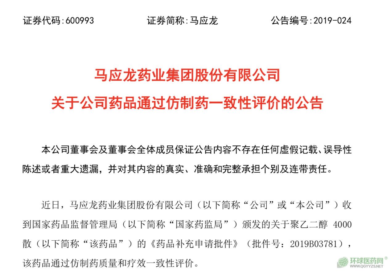 9月30日,馬應(yīng)龍藥業(yè)發(fā)布公告,公司收到國家藥監(jiān)局頒發(fā)的關(guān)于聚乙二醇 4000 散的《藥品補(bǔ)充申請(qǐng)批件》,該藥品通過仿制藥質(zhì)量和療效一致性評(píng)價(jià)。