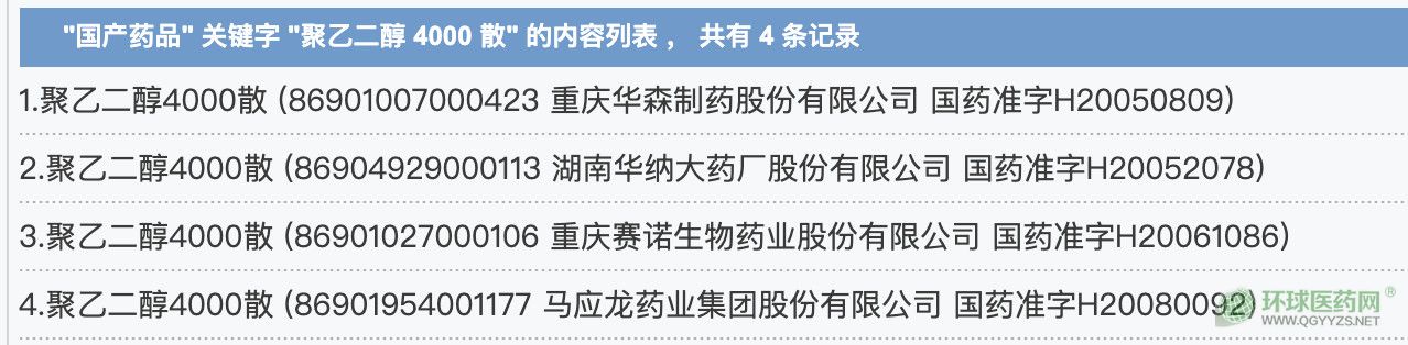 賽柏藍(lán)在國家藥監(jiān)局官網(wǎng)以“聚乙二醇 4000 散”為關(guān)鍵詞查詢,共有4條批文,分別屬于重慶華森制藥股份有限公司、湖南華納大藥廠股份有限公司、重慶賽諾生物藥業(yè)股份有限公司、馬應(yīng)龍藥業(yè)集團(tuán)股份有限公司。