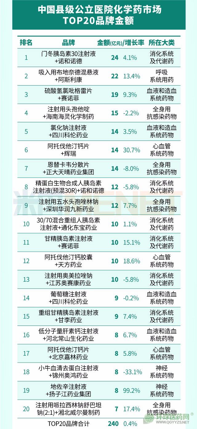最新數(shù)據(jù),中國城市和縣級(jí)公立醫(yī)院品牌銷售額TOP20公布,多個(gè)大品種上榜。