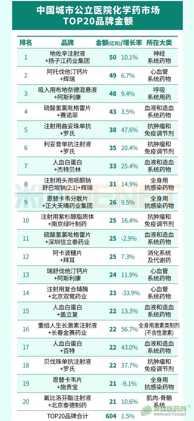 其中,在中國城市公立醫(yī)院化學(xué)藥市場TOP20中,揚(yáng)子江藥業(yè)的地佐辛注射液、輝瑞的阿托伐他汀鈣片、阿斯利康的吸入用布地奈德混懸液、賽諾菲的硫酸氫氯吡格雷片和羅氏的注射用曲妥珠單抗位列前五名。