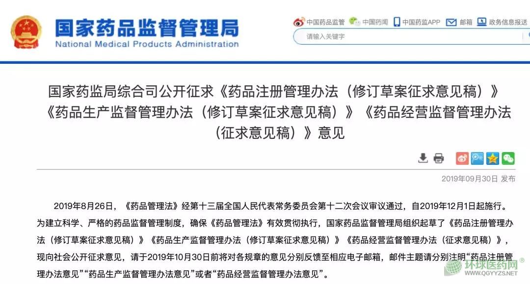 9月30日,國家藥品監(jiān)督管理局官網(wǎng)對藥品注冊、生產(chǎn)、經(jīng)營三個規(guī)章公開征求意見。三個規(guī)章分別為:《藥品注冊管理辦法(修訂草案征求意見稿)》《藥品生產(chǎn)監(jiān)督管理辦法(修訂草案征求意見稿)》《藥品經(jīng)營監(jiān)督管理辦法(征求意見稿)》。