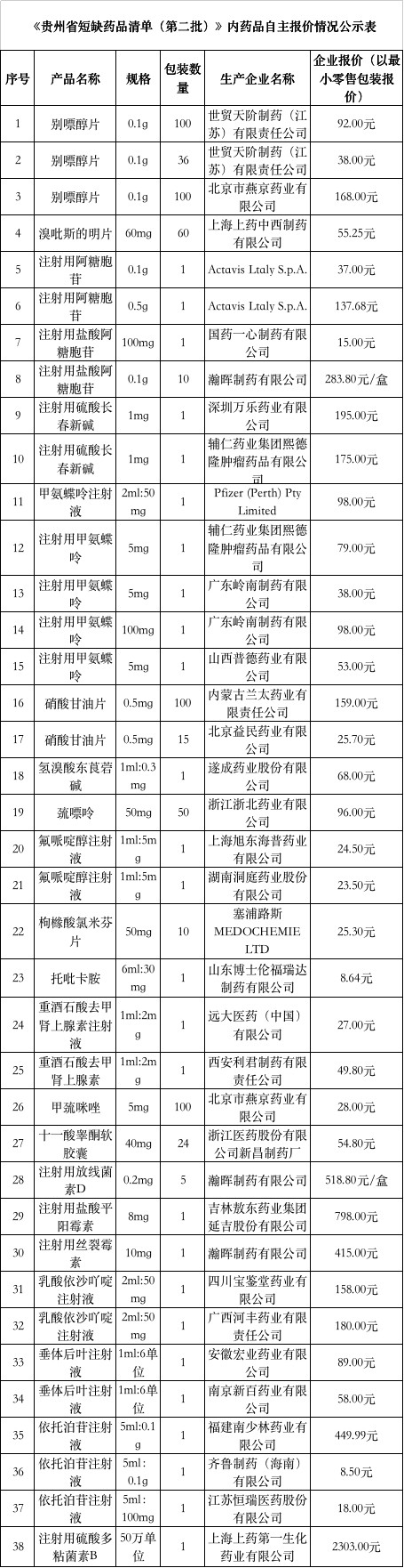 據賽柏藍梳理,“貴州省短缺藥品清單(第二批)”共包含短缺藥38個,別嘌醇片、注射用阿糖胞苷、注射用硫酸長春新堿、甲氨蝶呤注射液、硝酸甘油片、重酒石酸去甲腎上腺素注射液、注射用絲裂霉素、依托泊苷注射液等藥品在列。