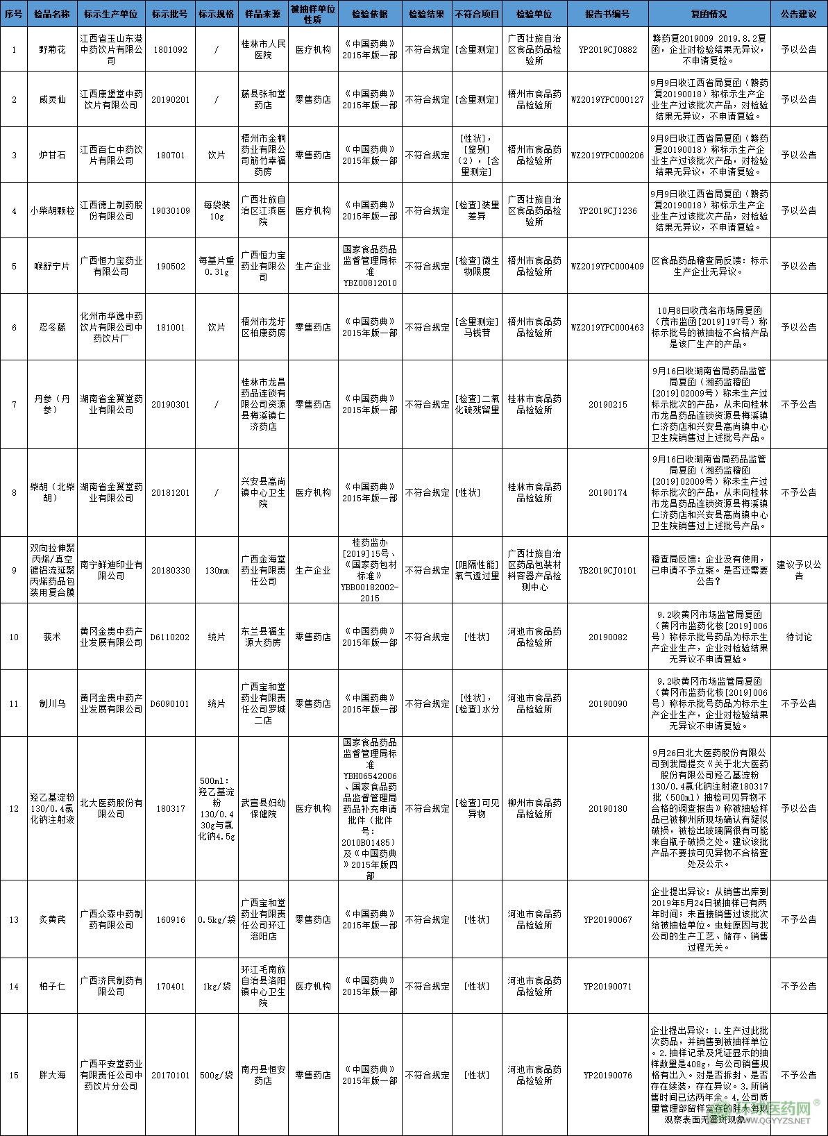 14號(hào),廣西藥監(jiān)局官網(wǎng)發(fā)布《廣西壯族自治區(qū)藥品監(jiān)督管理局藥品質(zhì)量公告》 (2019年第7期)2019年公告第16號(hào),一批常見(jiàn)藥被查不合格,涉及爐甘石、小柴胡顆粒等暢銷藥...