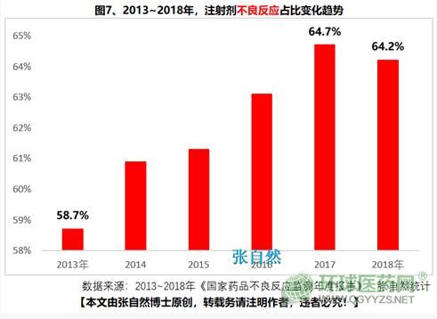 注射劑的不良反應(yīng)一直居高不下,并還不斷上升之勢,但2018年開始已有所下降,已由2017年的64.7%下降到了2018年的64.2%,下降了0.5個百分點。