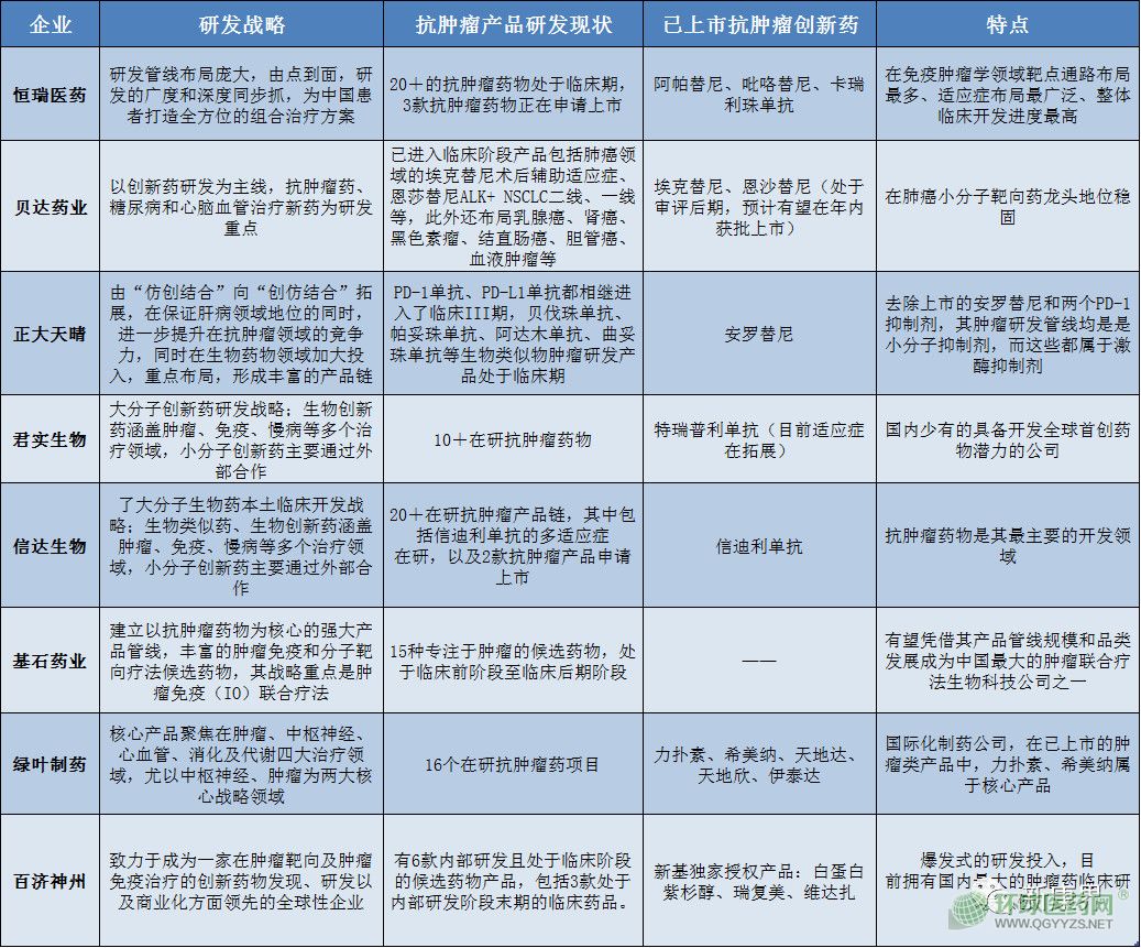 抗腫瘤新藥的研發(fā)離不開藥企的努力,下面選取8個國內代表性的創(chuàng)新藥研發(fā)企業(yè),梳理一下國內抗腫瘤創(chuàng)新藥領域的研發(fā)情況: