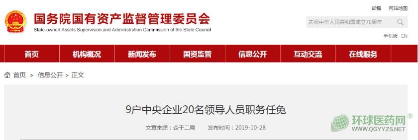 10月28日,國資委發(fā)布《9戶中央企業(yè)20名領(lǐng)導人員職務(wù)任免》通知,其中值得醫(yī)藥行業(yè)關(guān)注的對象為中國醫(yī)藥集團頂層領(lǐng)導的更換:中國醫(yī)藥集團任命劉敬楨任為其集團的黨委書記、董事長;同時免去郭建新的中國醫(yī)藥集團有限公司黨委書記職務(wù),郭建新將不再擔任中國醫(yī)藥集團有限公司董事長、董事職務(wù),退休。
