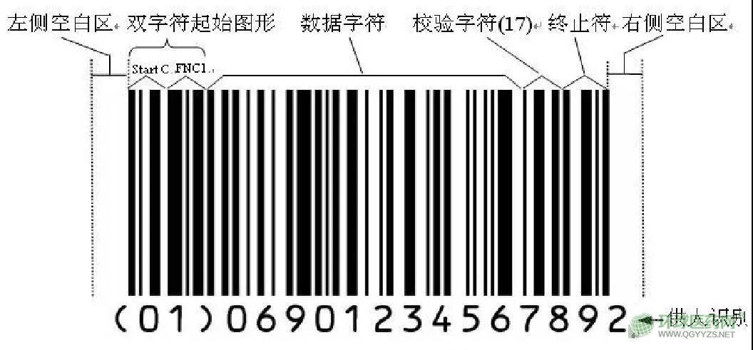 據(jù)了解,GS1-128條碼的符號(hào)結(jié)構(gòu)包括左側(cè)空白區(qū)、雙字符起始圖形、數(shù)據(jù)字符、校驗(yàn)字符、終止符和右側(cè)空白區(qū),如下圖: