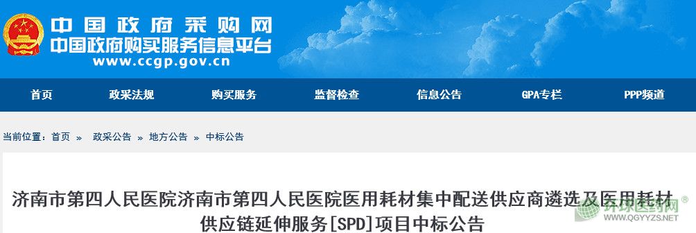 近日,中國(guó)政府采購(gòu)網(wǎng)公布了《濟(jì)南市第四人民醫(yī)院醫(yī)用耗材集中配送供應(yīng)商遴選及醫(yī)用耗材供應(yīng)鏈延伸服務(wù)[SPD]項(xiàng)目中標(biāo)公告》(以下簡(jiǎn)稱《中標(biāo)公告》)。