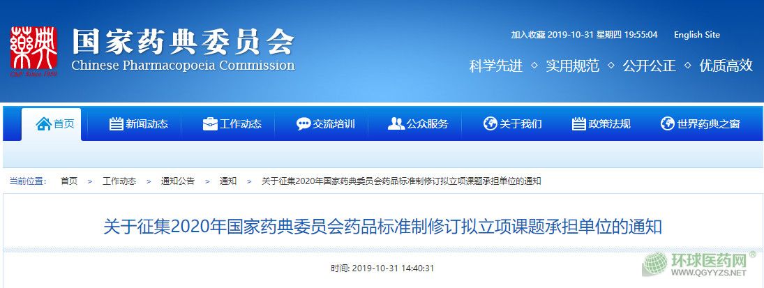 10月31日,國家藥典委員會在官網掛出《關于征集2020年國家藥典委員會藥品標準制修訂擬立項課題承擔單位的通知》,通知附件披露了藥典委擬定的2020年度擬立項課題。