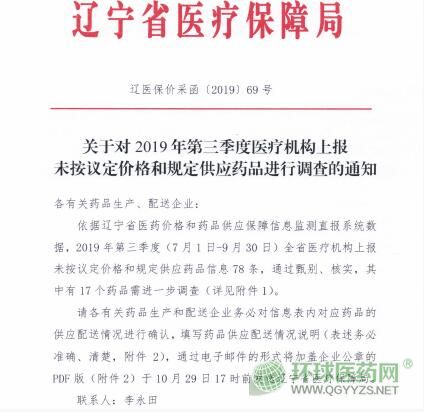來源:遼寧省藥品和醫(yī)用耗材集中采購網(wǎng)《關(guān)于對2019年第三季度醫(yī)療機構(gòu)上報未按議定價格和規(guī)定供應(yīng)藥品進行調(diào)查的通知》