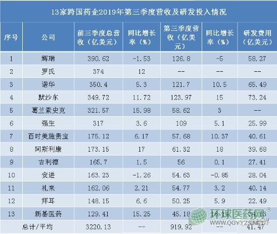 根據(jù)跨國藥企發(fā)布的第三季財報看,我們統(tǒng)計的這13家企業(yè)前三季度總營收超過了3000億美元,除了個別企業(yè)業(yè)績呈現(xiàn)負增長外,大部分企業(yè)銷售額是正向增長的。另外,在研發(fā)投入上,統(tǒng)計到數(shù)據(jù)的11家企業(yè)今年前三季度的研發(fā)費用均值為44.78億美元,若是按這些企業(yè)總營收的均值算,則平均研發(fā)費用率約為18%。