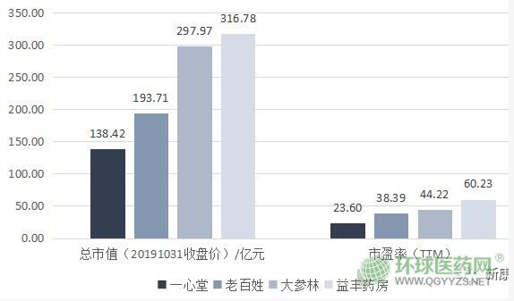 5、市值:益豐藥房市值與市盈率均位居首位
