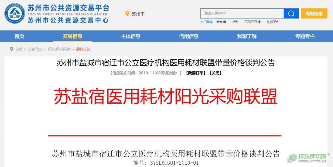 11月8日,江蘇省蘇州市公共資源交易平臺發(fā)布《蘇州市鹽城市宿遷市公立醫(yī)療機構(gòu)醫(yī)用耗材聯(lián)盟帶量價格談判公告》(下稱《公告》),成立蘇鹽宿醫(yī)用耗材陽光采購聯(lián)盟。