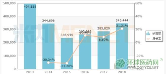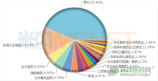 注射用頭孢曲松鈉原研廠家為羅氏,目前國(guó)內(nèi)獲批生產(chǎn)注射用頭孢曲松鈉的企業(yè)共有89家。米內(nèi)網(wǎng)數(shù)據(jù)顯示,2018年中國(guó)公立醫(yī)療機(jī)構(gòu)終端注射用頭孢曲松鈉銷售額為34.64億元,同比增長(zhǎng)21.21%,羅氏占據(jù)43.43%的市場(chǎng)份額,臺(tái)灣泛生制藥占比15.35%,金城金素則占比2.92%。