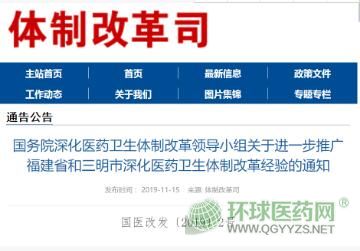11月15日,國家衛(wèi)健委體制改革司發(fā)布《國務(wù)院深化醫(yī)藥衛(wèi)生體制改革領(lǐng)導(dǎo)小組關(guān)于進(jìn)一步推廣福建省和三明市深化醫(yī)藥衛(wèi)生體制改革經(jīng)驗(yàn)的通知》。文件提到2020年,按照國家統(tǒng)一部署,擴(kuò)大國家組織集中采購和使用藥品品種范圍。
