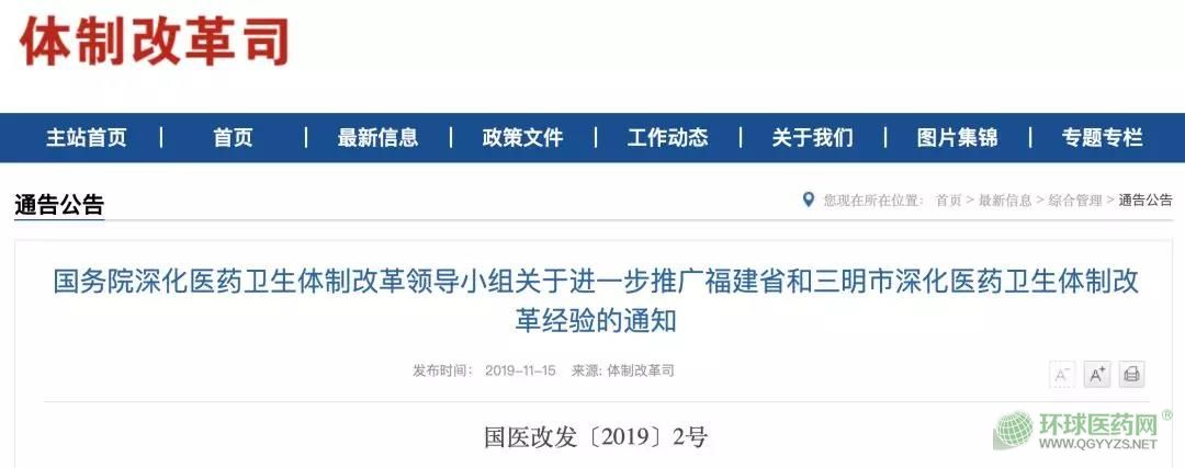 11月15日,國務院深化醫(yī)藥衛(wèi)生體制改革領導小組下發(fā)《關于進一步推廣福建省和三明市深化醫(yī)藥衛(wèi)生體制改革經驗的通知》(以下簡稱“通知”)釋放重大信號。