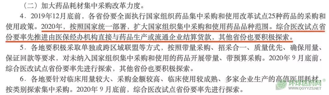 2020年,按照國家統一部署,擴大國家組織集中采購和使用藥品品種范圍。綜合醫(yī)改試點省份要率先推進由醫(yī)保經辦機構直接與藥品生產或流通企業(yè)結算貨款,其他省份也要積極探索。